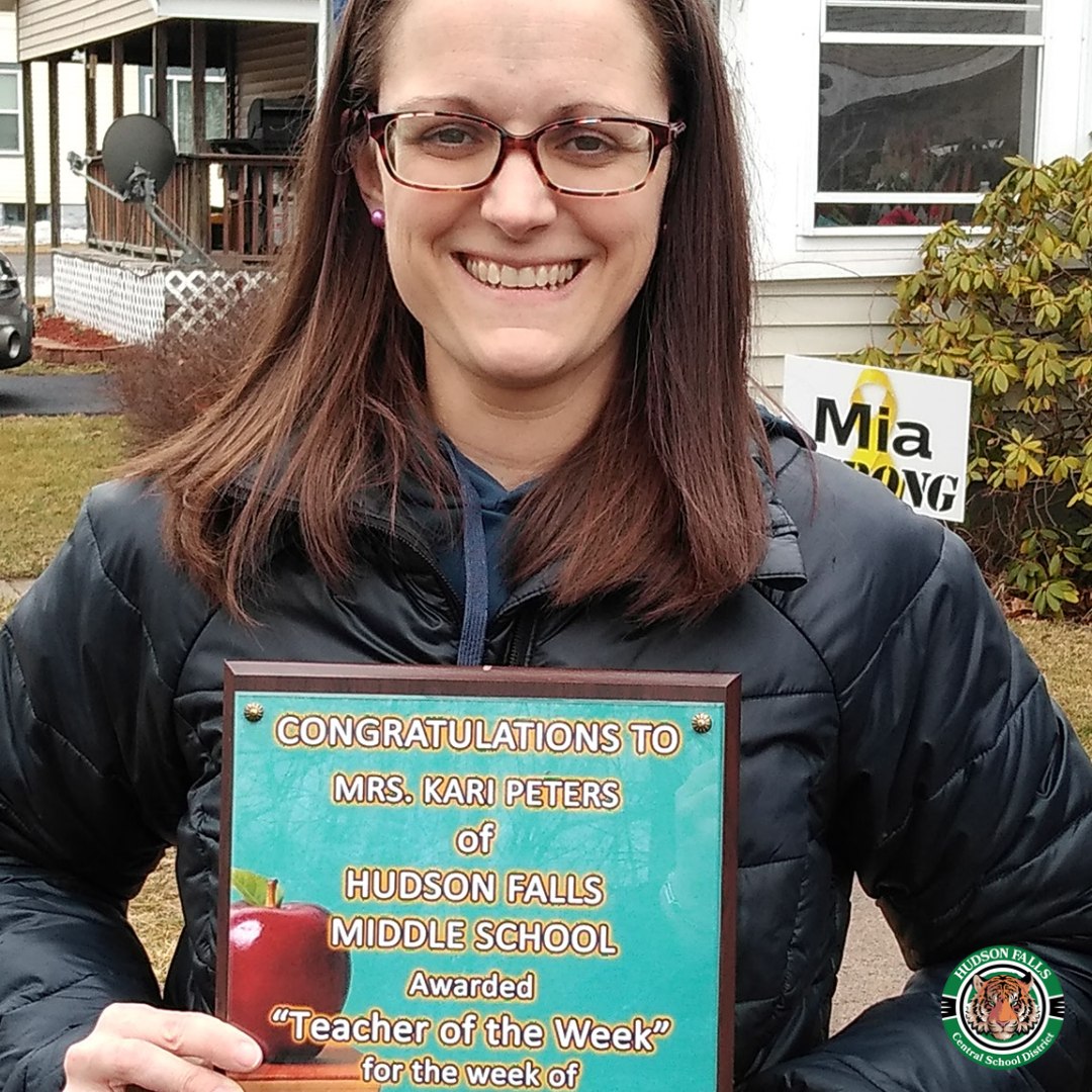 “Mrs. Peters has been instrumental in helping the students with care, compassion, and comfort. She has gone above and beyond to help families that have been affected by being quarantined. Mrs. Peters’ has done personal errands for families and called hundreds of students to check on them daily. Mrs. Peters’ caring nature is hard to find. Her school spirit is infectious and she is a positive influence and inspiration to the students and their families. Congratulations to Kari Peters for a job well done as a school nurse at the Hudson Falls Middle School!”