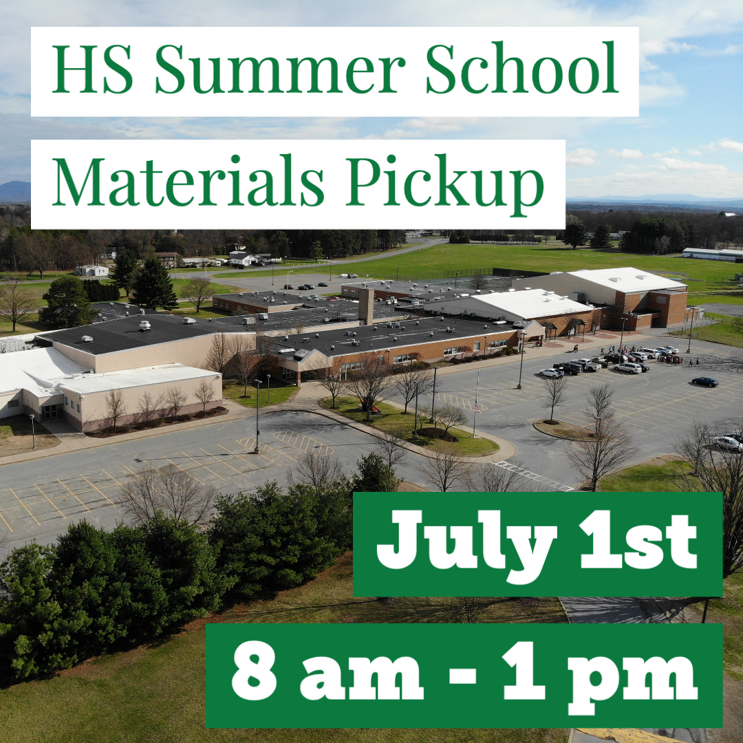 High School Summer School students may pick up their materials and Chromebooks on Wednesday, 7/1/2020 from 8 am to 1 pm at the High School.