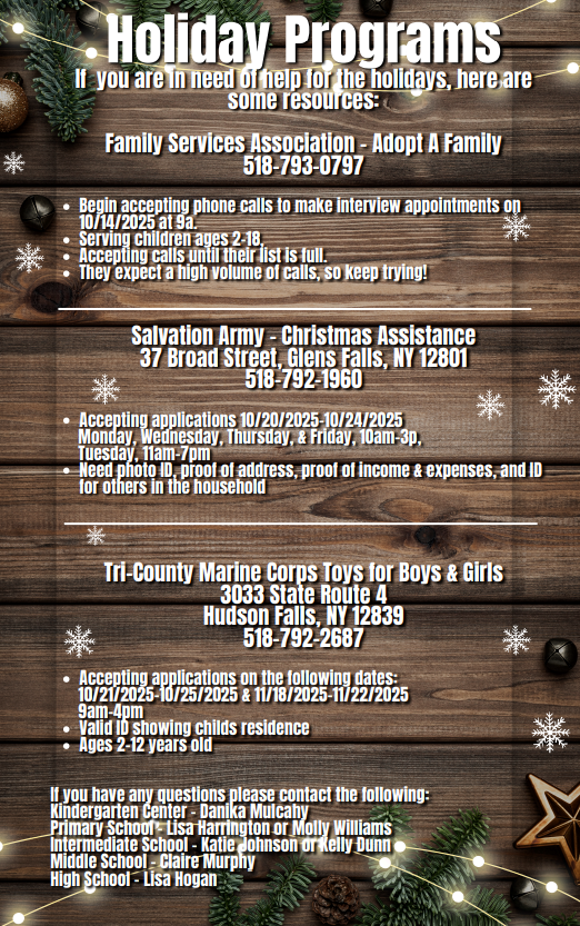 - Primary School – Lisa Harrington or Molly Williams (518) 681- 4487